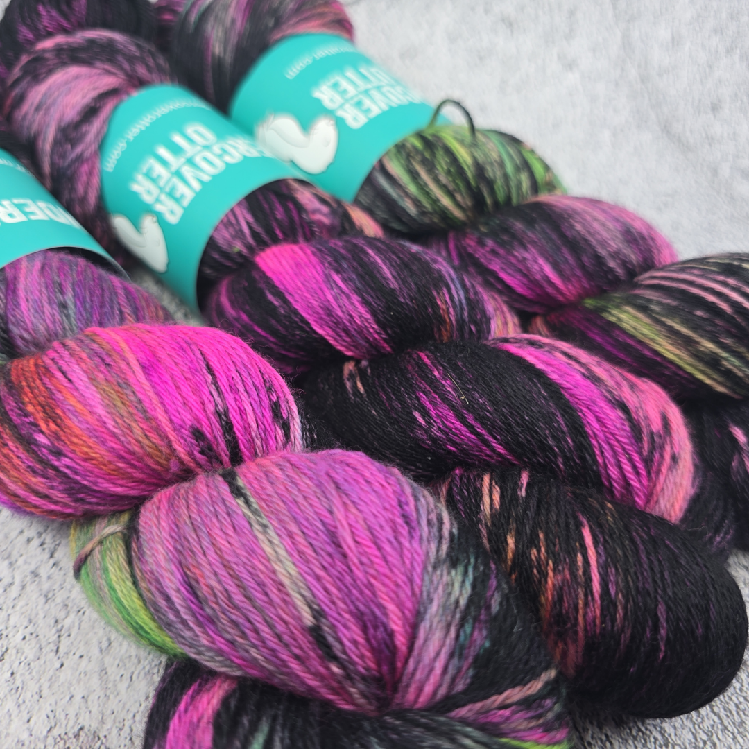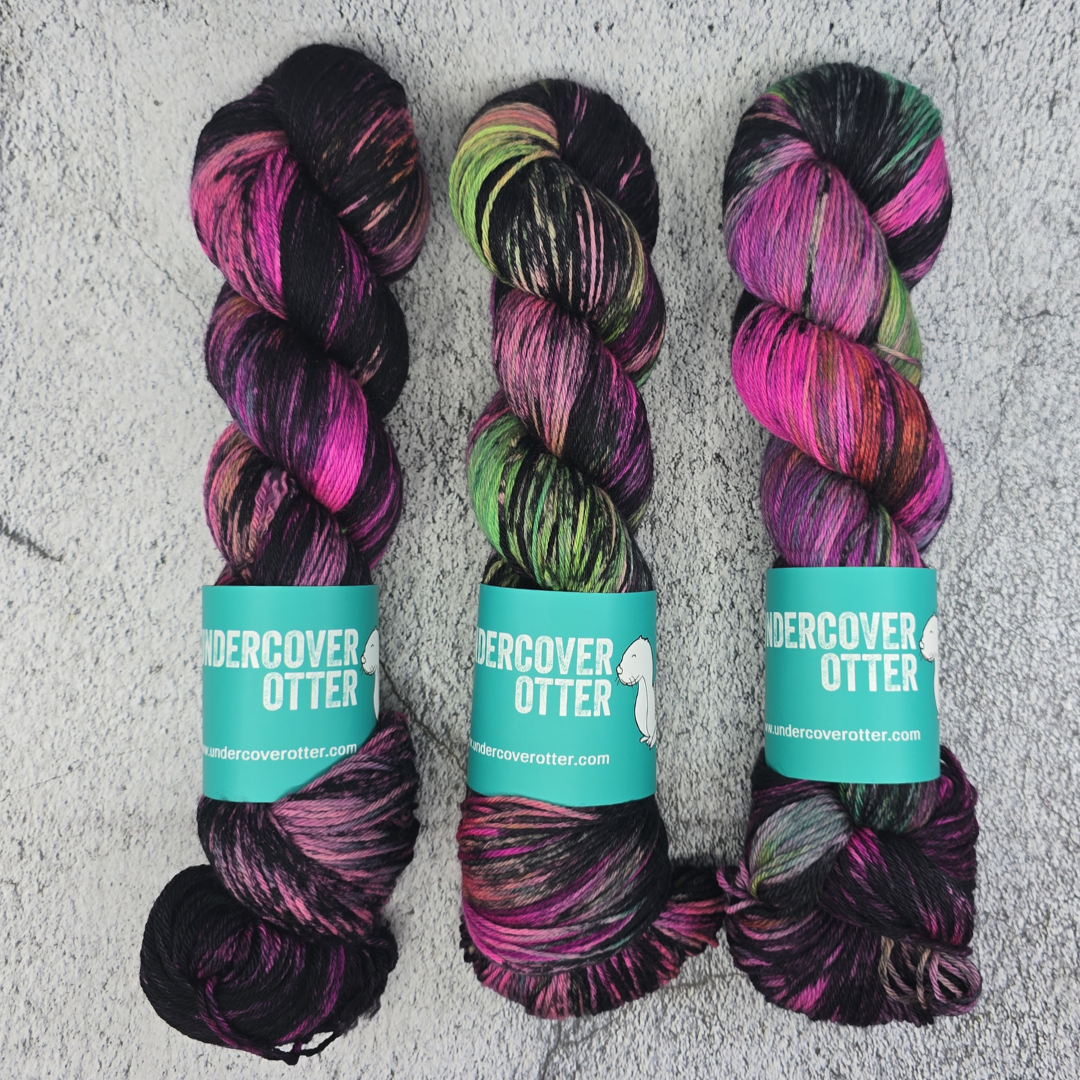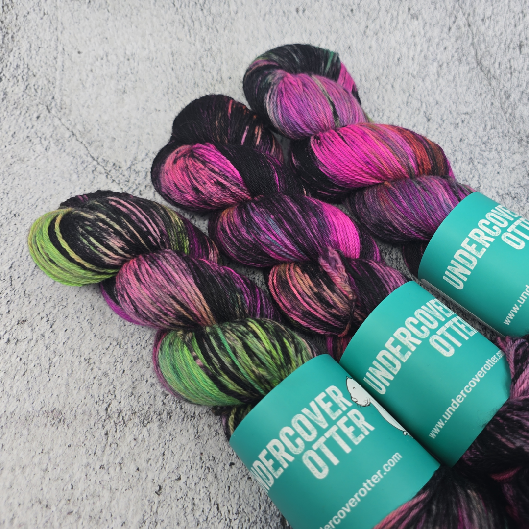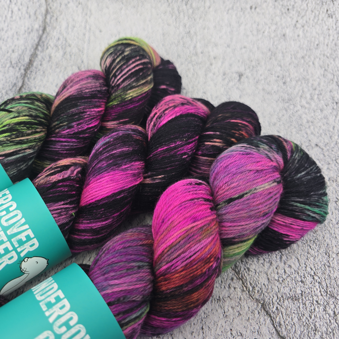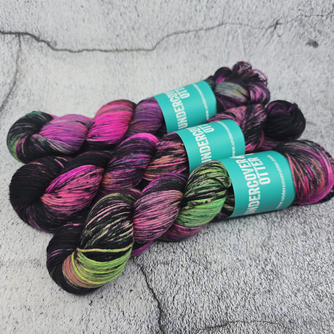 Not to be confused with our Arcana Horror colorway. Arcane Terror is a slightly messier version of this green and pink powerhouse.